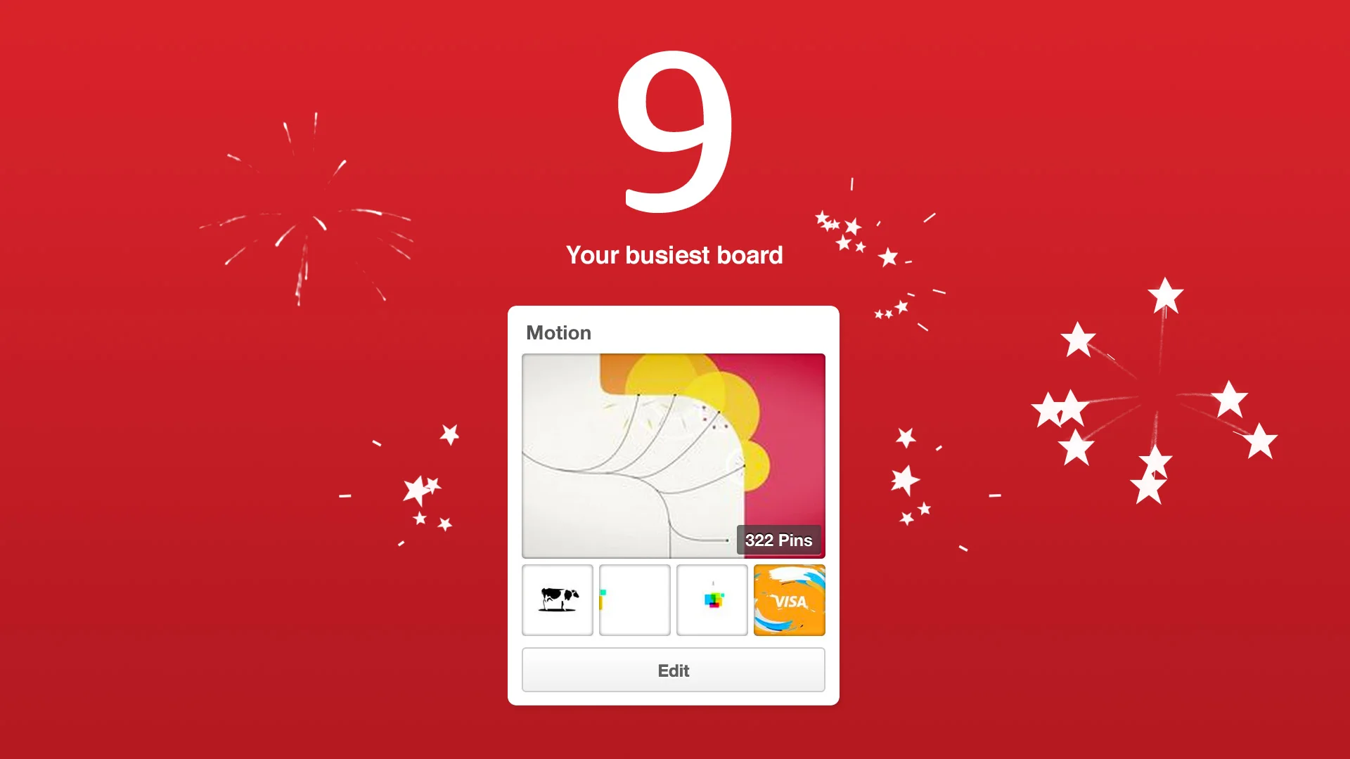Pinterest made a custom animation for each user based on their statistics for 2014. I helped come up with a visual style and prototyped animation for this end of the year wrap up. Their engineers took my assets and created a dynamic video based on a users actual statistics